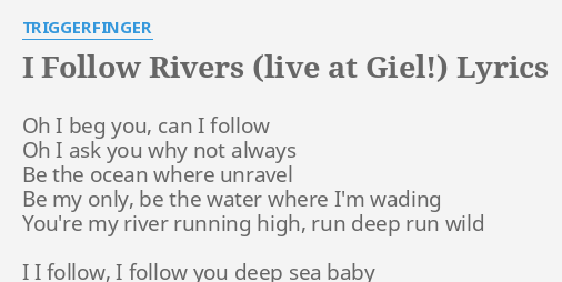 He the rebel Im the daughter. I Follow RiversOh I beg you can I followOh I ask you why not alwaysBe the ocean where unravelBe my only be the water and Im wadingYoure my river runnin. I-I follow I follow you dark room honey Ill follow you. Run deep run wild. I Follow Rivers Artista. Youre my river running high. Youre my river running high Run deep run wild. Deep sea baby I follow you. Stream I I follow I follow you deep sea baby.